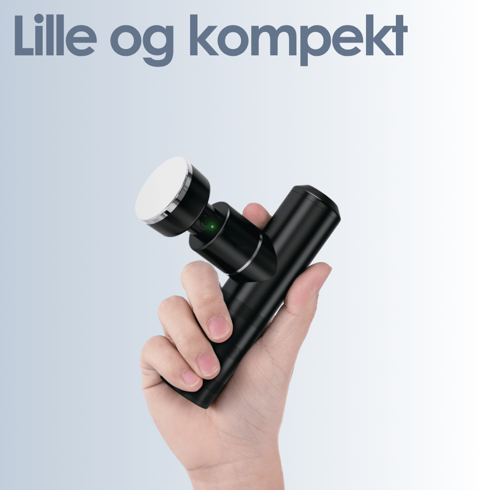 Med en højde på kun 14,5 cm og en vægt på 350 g passer massagepistolen nemt i din træningstaske eller håndbagage. Den leverer 1500–3000 RPM og 6 mm slagdybde – præcis som større modeller.