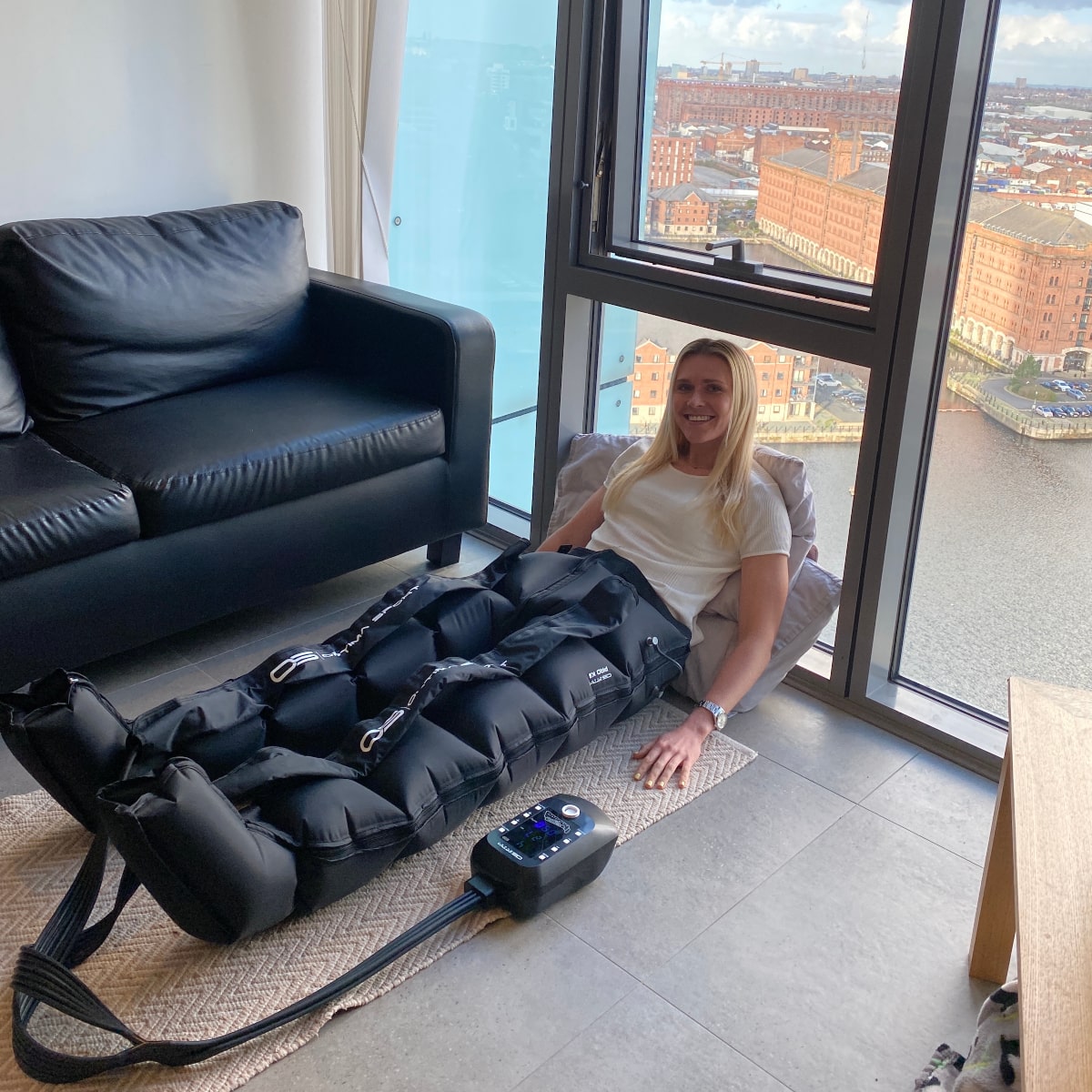 Er du i gang med et genoptræningsforløb er det en god idé at reducere intensiteten og få en lymfedrænage-behandling med et lavt tryk på ca. 30-150mm Hg, hvilket du nemt kan indstille på kontrolleren. Husk også at slukke kamre hvis du føler behov for det.