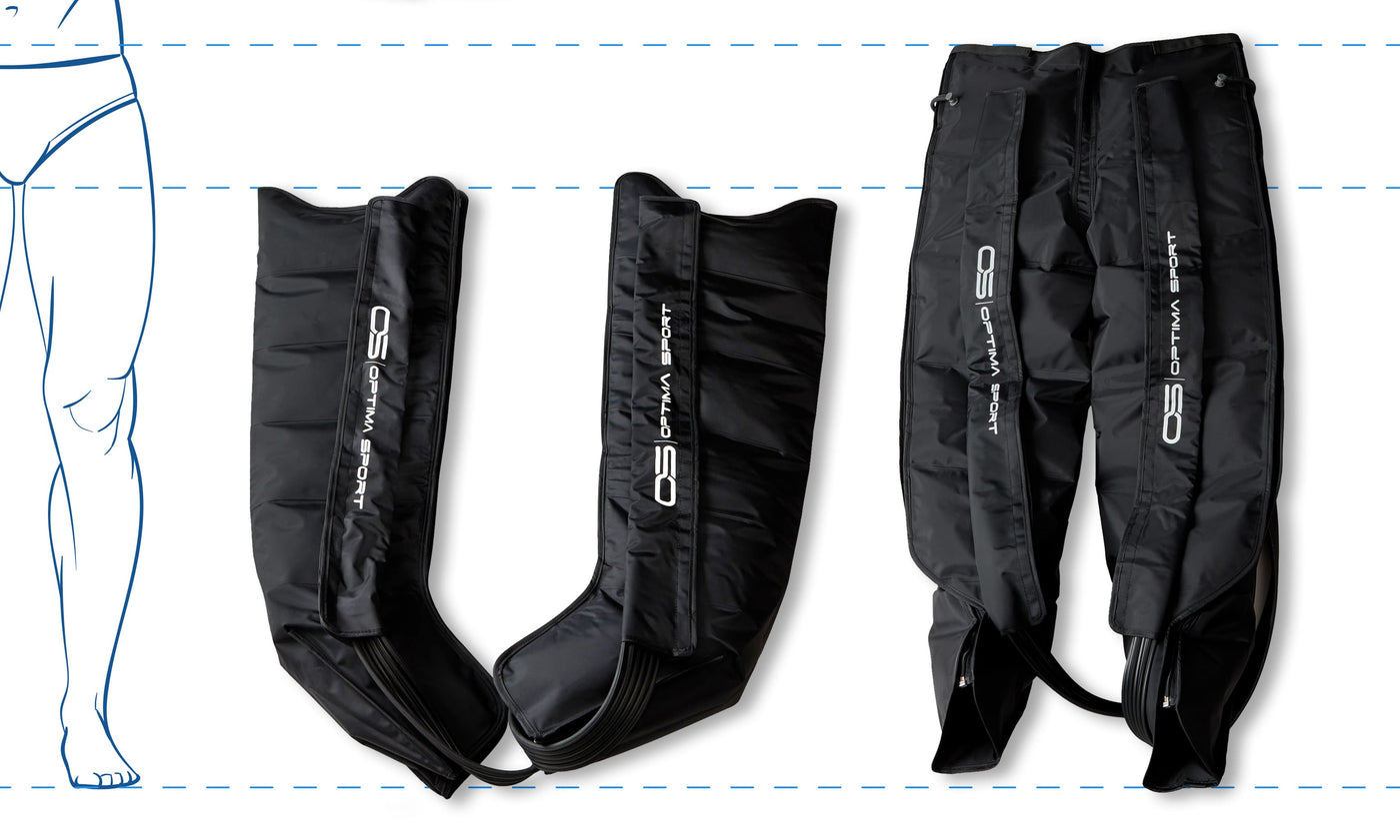 På Optima Sport Recovery Pants K8, uanset om det er stationær- eller batterienhed, er der 8 kamre som er fordelt således: 1 kammer til foden, 3 kamre omkring læggen og 3 kamre omkring lårene og 1 kammer omkring hofte og baller