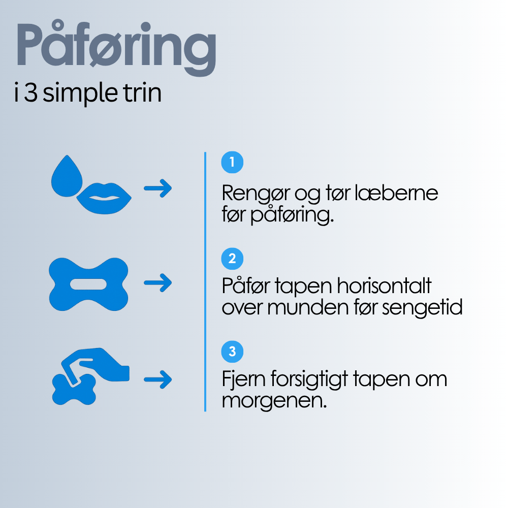 - Påfør tapen horisontalt over munden før sengetid.
