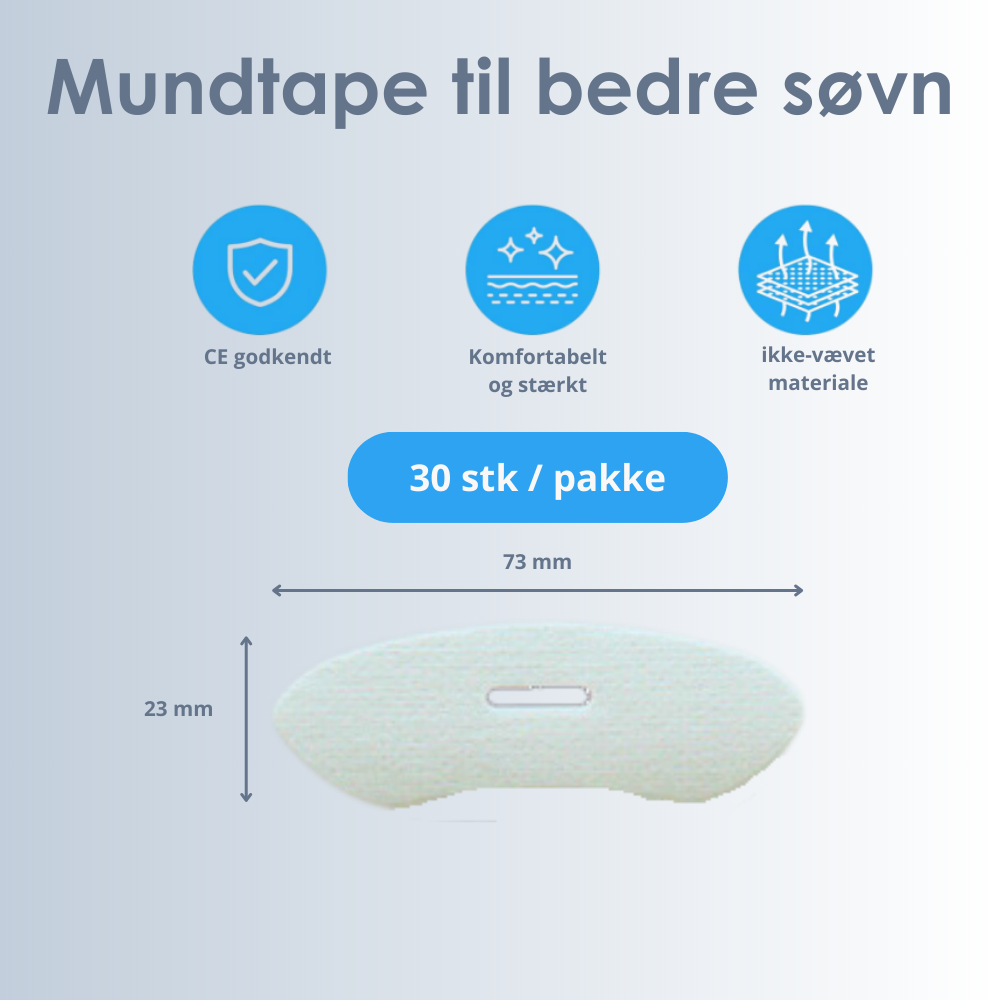 Bemærk: Dette produkt er designet til at fremme næseånding under søvn. Hvis du lider af søvnapnø, astma eller andre respiratoriske lidelser, bør du konsultere en læge, før du bruger mundtape.