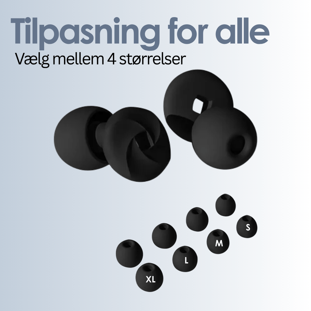 Vi ved, at hver øregang er unik. Derfor kommer vores ørepropper til søvn med fire forskellige størrelser af silikonepropper, så du kan finde den perfekte pasform. Den tætte forsegling sikrer ikke kun bedre støjreduktion, men også at propperne bliver siddende hele natten – selv hvis du bevæger dig meget i søvne.